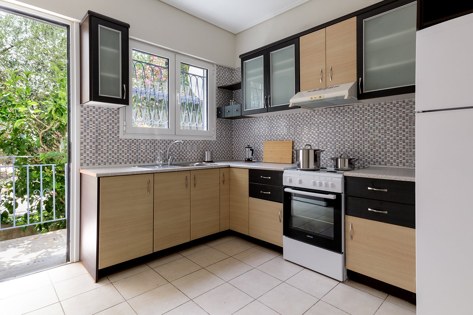 Πλήρως εξοπλισμένη με ηλεκτρική κουζίνα 4 εστιών με φούρνο ψυγείο και καφετιέρα